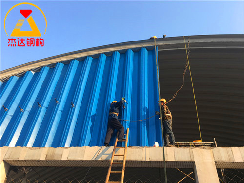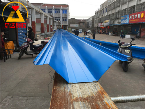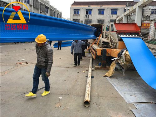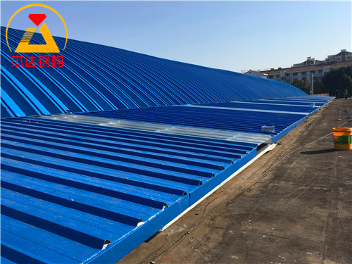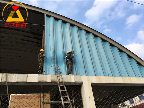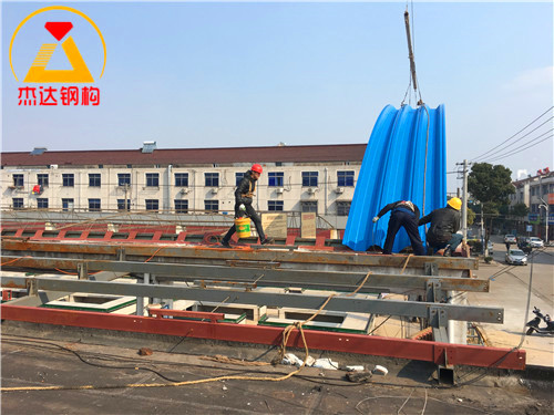 - 安裝階段:拱形屋頂瓦由杰達無梁拱設備現場壓型成型,逐榀吊裝拼接,完成后再依次安裝山墻瓦及過道屋面板。