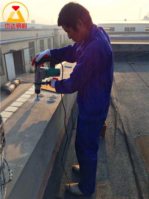 穿墻預埋件通常沿墻體頂端均勻間隔布置,配合膨脹螺栓或化學螺栓加固固定。此工藝主要解決在原有建筑沒有預留預埋件情況下的施工需求,常見位置包括水槽邊或圈梁部位。以下圖片來自江蘇杰達鋼結構工程有限公司在山東濰坊馳騁實業有限公司倉間罩棚施工現場,展示了穿墻預埋件的具體施工過程。
