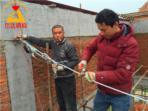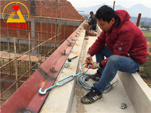 拱形屋頂?shù)拇u墻上口以及全鋼結構的鋼柱頂部通常會安裝拉鋼絲繩,以增強結構的受力能力。鋼絲繩一般選用M12或M14規(guī)格,既能滿足承載需求,也保證了耐久性。