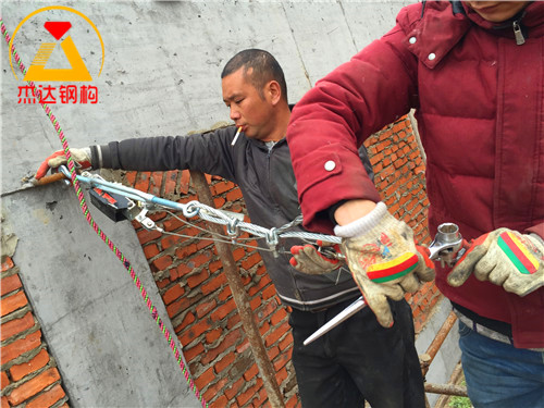圖中展示了鋼絲繩拉緊裝置的現(xiàn)場應用,反映出施工環(huán)節(jié)的技術細節(jié)和操作規(guī)范,有助于提升整體工程質量。