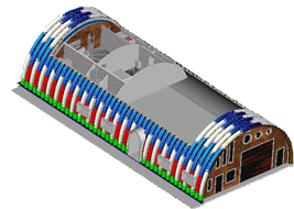 拱形屋頂以0.6-1.5毫米厚的專用彩涂卷板為原料,采用現(xiàn)場壓板、鎖邊、吊裝等工藝形成整體結(jié)構(gòu)。其設(shè)計簡潔且施工快速,有助于縮短工期并節(jié)約投資成本。此類屋頂結(jié)構(gòu)適合于糧食倉儲、工業(yè)廠房、物流市場及車輛庫房等多種場景。