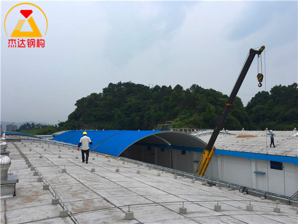 本工程跨度為18米,長度86米,總建筑面積達1548平方米,采用拱形屋頂設計。江蘇杰達鋼結構工程有限公司承擔了永安直屬庫內倉間罩棚的制作與安裝工作,主要包含托板的焊接和安裝,灰藍色的K-SPAN倉間罩棚整體架構,以及三道采光帶的布置。