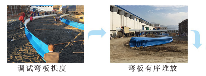3.施工現(xiàn)場要在建筑旁留有一定空地(其面積視工程大小而定)作為放自動滾壓機車拖車制作拱板和堆放成型后的拱板用地,當(dāng)屋面跨度較大時吊車設(shè)在室內(nèi)吊裝,因此施工要在山墻處留出入口。具體施工方案與土建施工單位協(xié)商確定。
