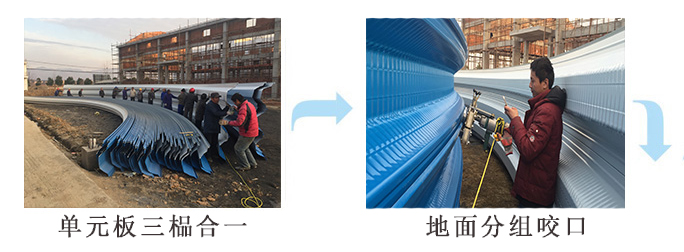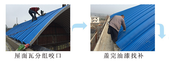 2.土建工程施工到檐口上皮標高時,應(yīng)按拱形屋頂構(gòu)造要求準確留出所有埋件,下一工序轉(zhuǎn)交杰達鋼構(gòu)施工人員進入工地進行拱形彩板安裝,待做完通風(fēng)、采光及噴涂室內(nèi)保溫層后即可退出現(xiàn)場。