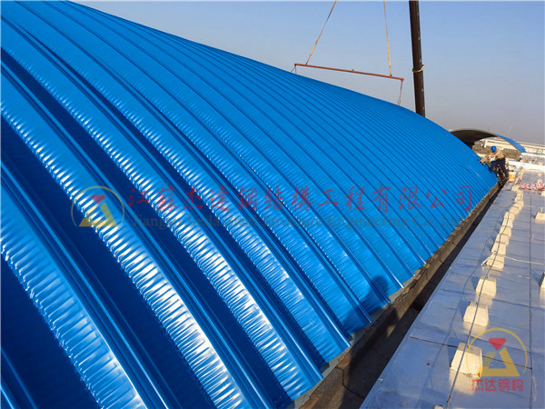 拱形屋頂是采用國(guó)際先進(jìn)的MIS240(914-610)配套設(shè)備,以0.6-1.5㎜厚專(zhuān)用彩涂成卷鋼板為原料,經(jīng)過(guò)現(xiàn)場(chǎng)壓板、鎖邊、吊裝后成型的大跨度屋面結(jié)構(gòu)。它設(shè)計(jì)施工周期短、投資少、施工快,廣泛適用于國(guó)家糧庫(kù)、工業(yè)廠房、集散市場(chǎng)、倉(cāng)儲(chǔ)庫(kù)房、車(chē)庫(kù)機(jī)庫(kù)等。