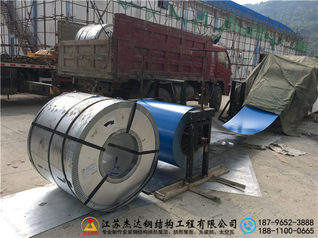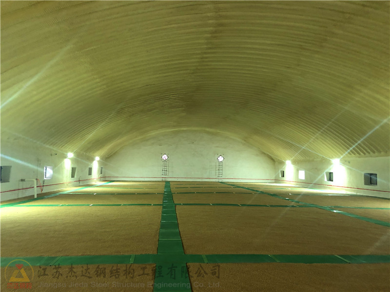 本工程由8棟糧油儲備庫組成,跨度達24米,長度48米。拱形屋頂設計采用雙層瓦結構,下層瓦厚度為1.0mm至1.2mm,上層瓦厚度為1.2mm,旨在增強屋頂的整體穩定性和防護能力。