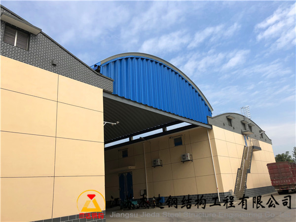 該項目位于江蘇省南京市浦口區糧食儲備庫內,罩棚跨度達16米,長度60米,采用拱形波紋鋼屋蓋結構。結構兩側設有250*250H型鋼,上方焊接托板,配合兩側桁架支撐。桁架外側覆蓋了通過壓制成型的拱形瓦片,用作山墻,增強整體穩定性與美觀度。