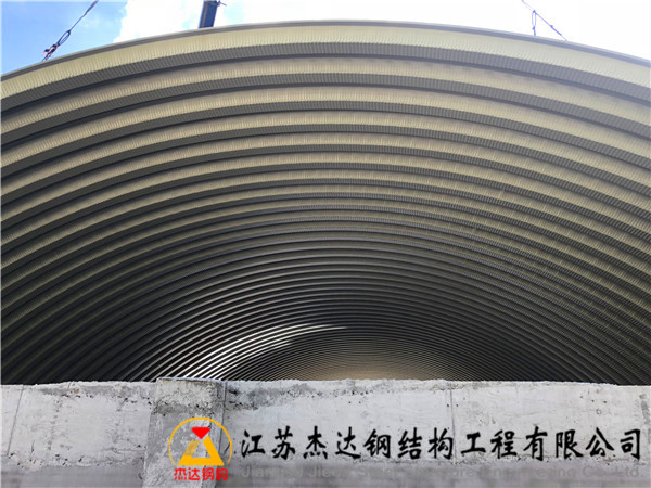 完工后的拱形波紋鋼屋蓋呈現出流暢的曲線與結構穩定性。矢跨比和拱高的比例設計保證了屋頂的承載能力與美觀性。