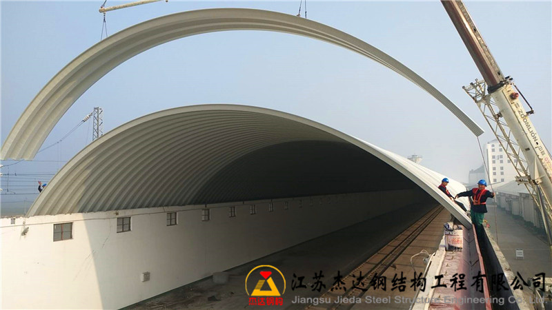 該工程的拱形屋頂位于河南周口紙店鎮內,主要作為中儲糧糧食儲備的罩棚使用。屋頂跨度達18米,拱高4.5米,結構穩固,功能明確。拱形屋頂兩側通過焊接在化學螺栓上的預埋鐵板固定,保證整體連接的牢固性。