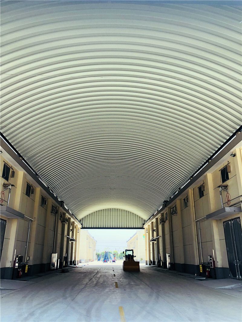 江蘇揚(yáng)州高郵糧庫拱形屋頂罩棚新建項(xiàng)目,采用現(xiàn)代鋼結(jié)構(gòu)工藝,結(jié)合實(shí)用性與美觀性,提升倉儲空間的功能與環(huán)境質(zhì)量。
