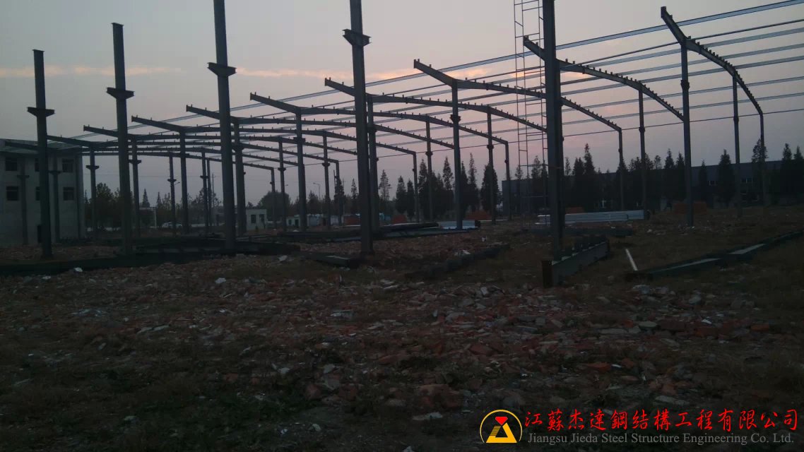 本工程為全鋼結構五連跨車間,采用多跨鋼架設計,確保空間利用最大化。主體鋼架部分由江蘇杰達鋼結構工程有限公司負責鋼梁的加工與制作,保證結構的質量和施工進度。